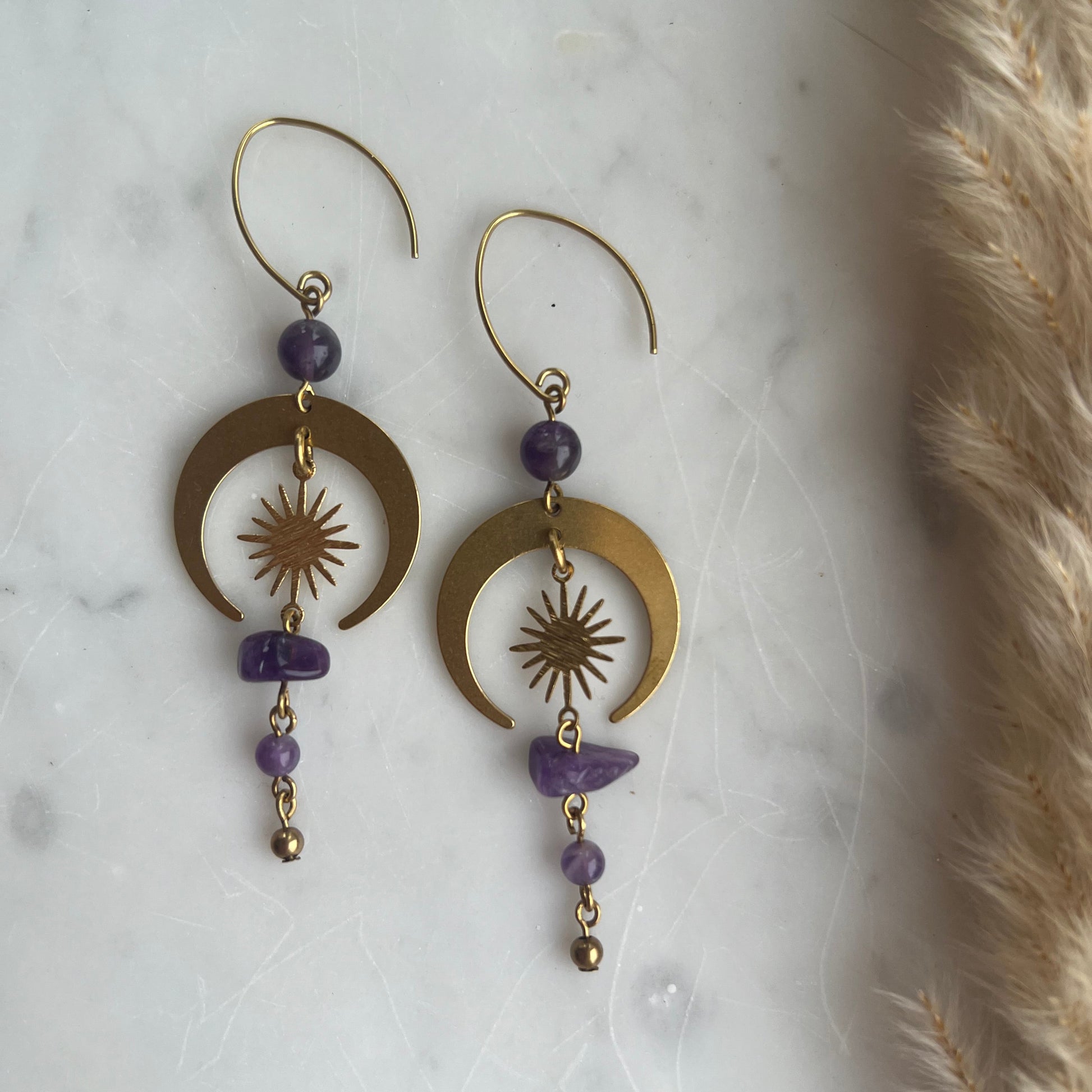 Framhäv din inre magi med dessa fantastiska örhängen. Med detaljer i mässing och pärlor i ametist ger de ett smycke med både skönhet och energi.