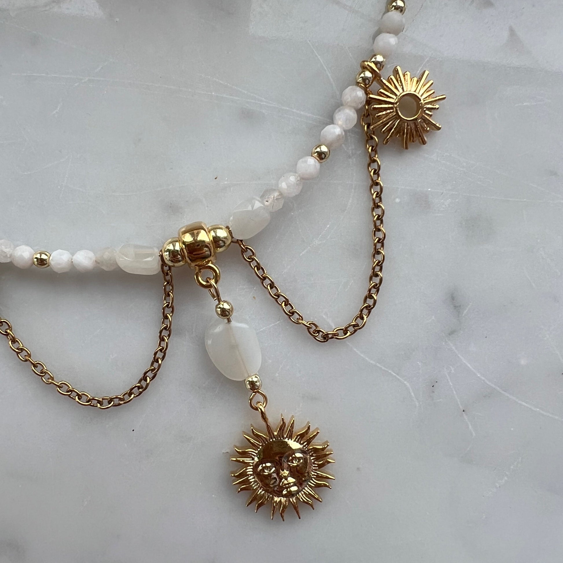 Ett helt unikt halsband i kortare modell. Här skapar månsten magi tillsammans med härliga solberlocker.